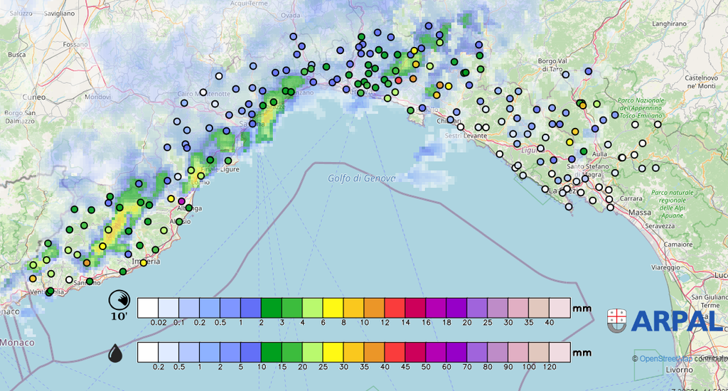 La struttura precipitativa che nelle ultime ore ha interessato il Mar Ligure dall'imperiese al confine fra Spezia e Genova è stata sospinta verso tutto il territorio di centro Ponente dallo scirocco.