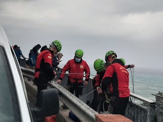 Un bastone da passeggio abbandonato sulla ringhiera che si affaccia sulla scogliera sul mare lungo l'Aurelia, all'altezza del promontorio di Torre del Mare a Bergeggi, e il proprietario scomparso.