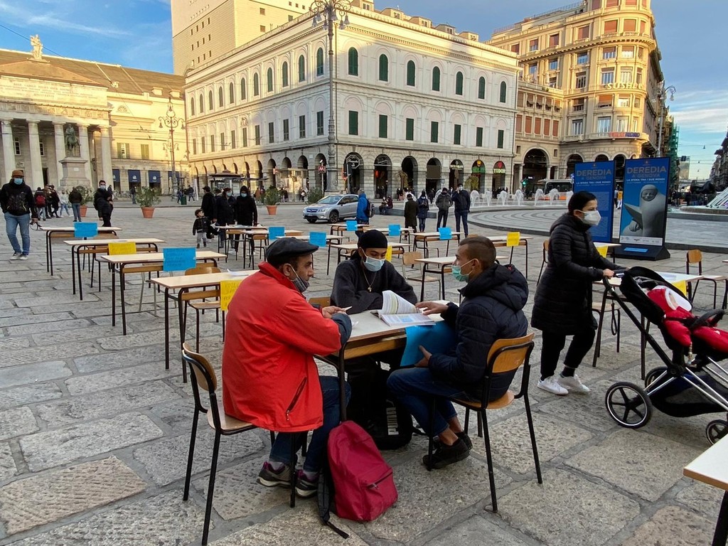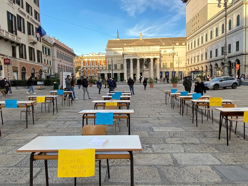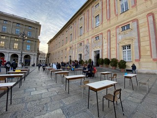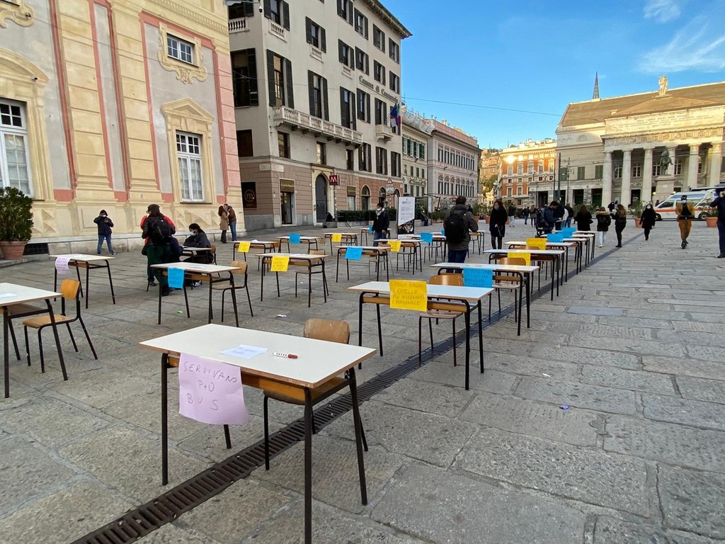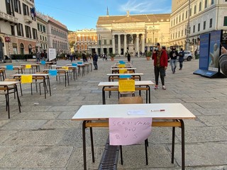 Il cuore di Genova si popola di banchi e sedie in un sabato pomeriggio piuttosto freddo, in piazza De Ferrari. La richiesta è quella di migliorare le infrastrutture scolastiche. “È già settembre” e “Priorità alla scuola” le organizzazioni che promuovono l'iniziativa, invocando una limitazione della Dad, giudicata strumento poco utile al fine di un buon apprendimento.