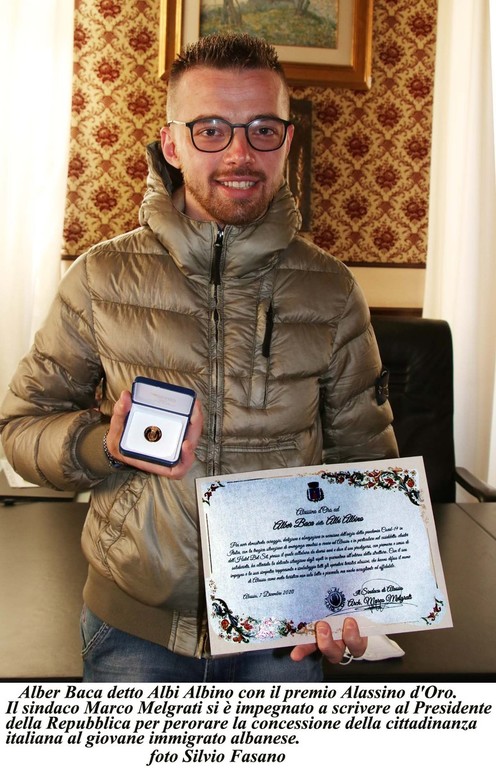 L’ALASSINO D’ORO 2020 E’ CONFERITO AD ALBER BACA DETTO ALBI ALBINO per aver dimostrato coraggio, dedizione e abnegazione in occasione dell’inizio della pandemia Covid-19 in Italia, con la tragica situazione di emergenza venutasi a creare ad Alassio e in particolare nel cosiddetto cluster dell’Hotel Bel Sit, presso il quale collabora da diversi anni e dove il suo prodigarsi con premura e senso di solidarietà ha alleviato la delicata situazione degli ospiti in quarantena all’interno della struttura. Con il suo impegno e la sua simpatia rappresenta e simboleggia tutti gli operatori turistici alassini che hanno difeso il nome di Alassio come meta turistica non solo bella e piacevole ma anche accogliente e affidabile.