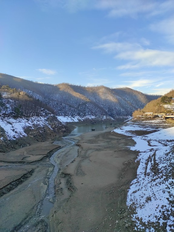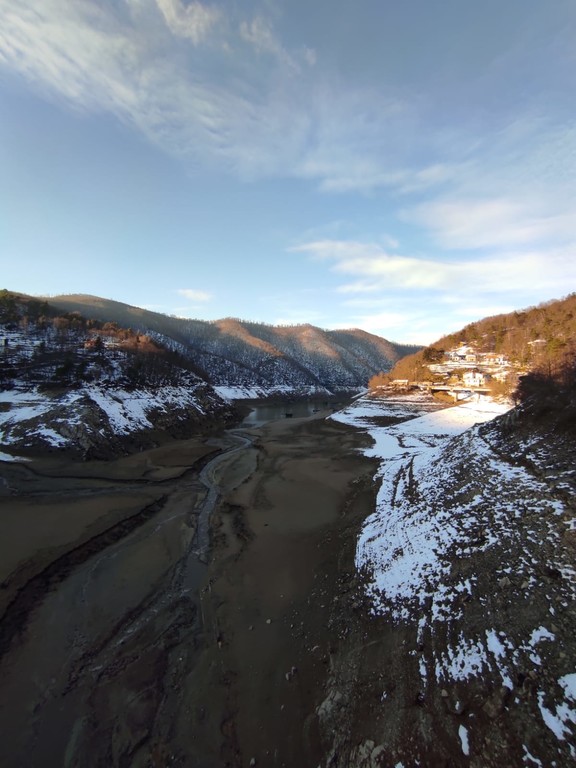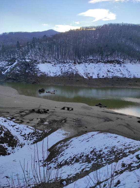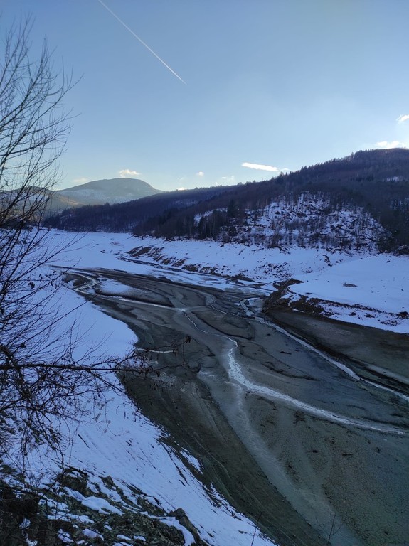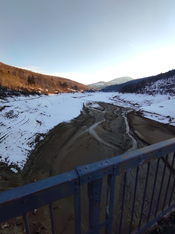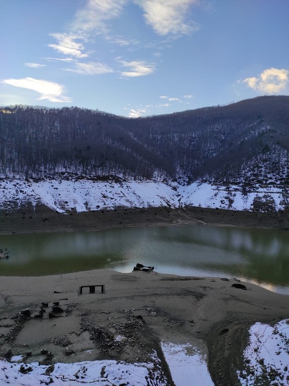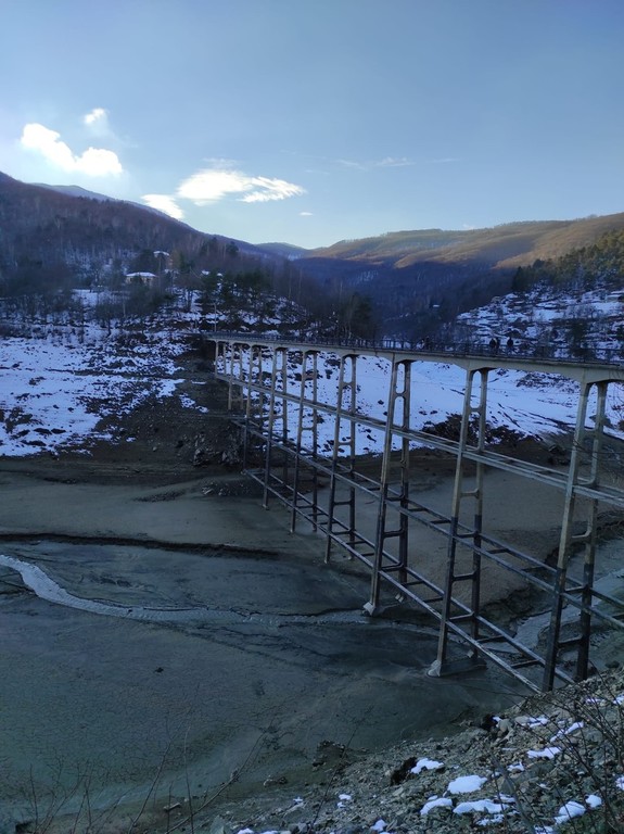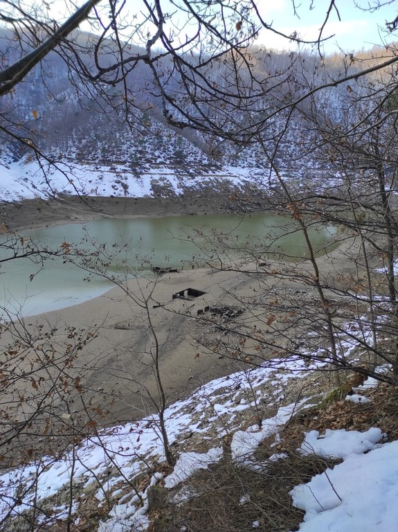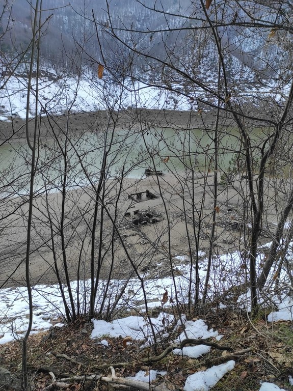 Un paesaggio che ha sempre il suo fascino. Lo svuotamento della diga di Osiglia ha fatto riemergere i ruderi dell'antico paese. La recente nevicata ha fatto il resto. Si tratta di un'operazione (pianificata con gli enti) che viene fatta periodicamente per lavori di manutenzione.