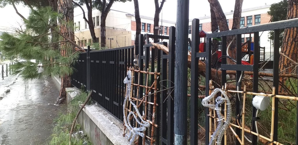 Nei giardini delle scuole elementari cellesi G. Baodo è crollato un ramo di un pino di importanti dimensioni.