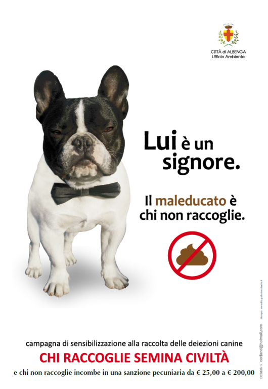 L'amministrazione comunale di Albenga, in collaborazione con la Polizia Locale e gli uffici comunali, ha avviato in questi giorni una nuova campagna di sensibilizzazione "Lui è un signore. Il maleducato è chi non raccoglie", rivolta alle famiglie in cui vivono i nostri amici a quattro zampe.