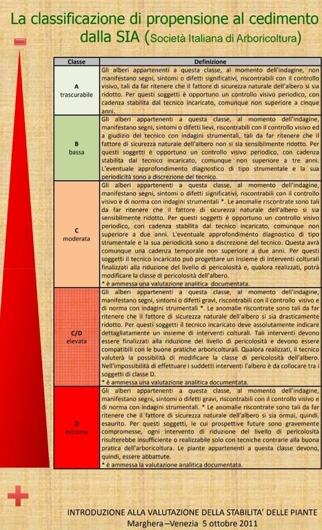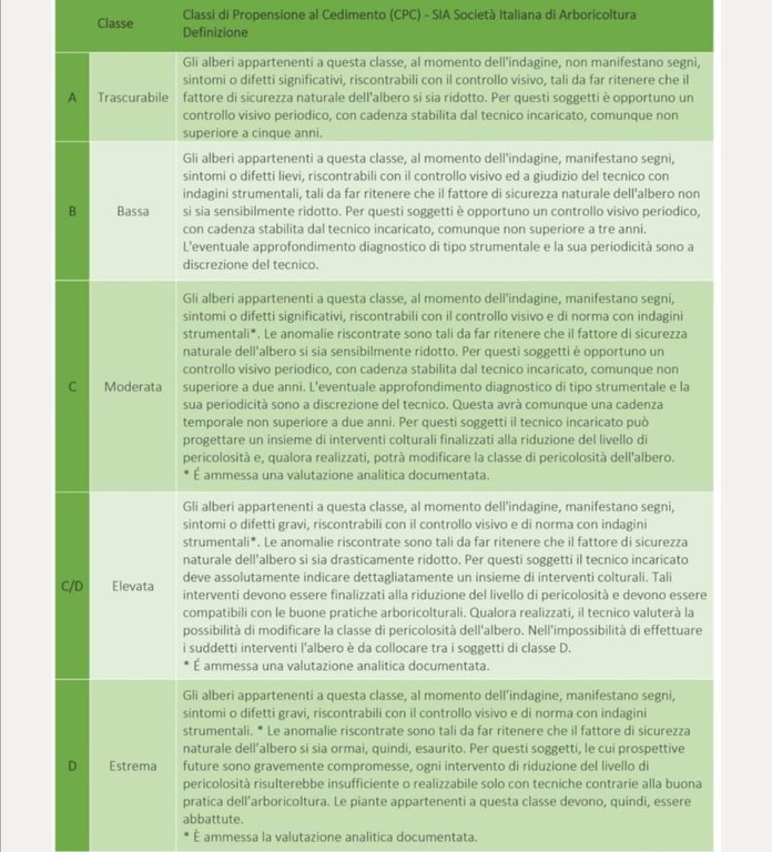 La Società Italiana di Arboricultura ha elaborato una classificazione della propensione al cedimento, individuando 5 classi: