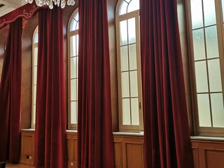 I vetri cattedrale gialli o bianchi (del lunotto) mancanti o lesionati sono stati sostituiti con altrettanti vetri uguali realizzati da vetreria specializzata. Sono stati lavati e restaurati i tendaggi e la mantovana in velluto poliestere rosso, resistenti al fuoco di classe 1, sostituiti la barra di scorrimento e i relativi ganci, con meccanismi similari adatti a tende di peso notevole. La carta da parati in velluto è stata restaurata eliminando strappi e parti mancanti.