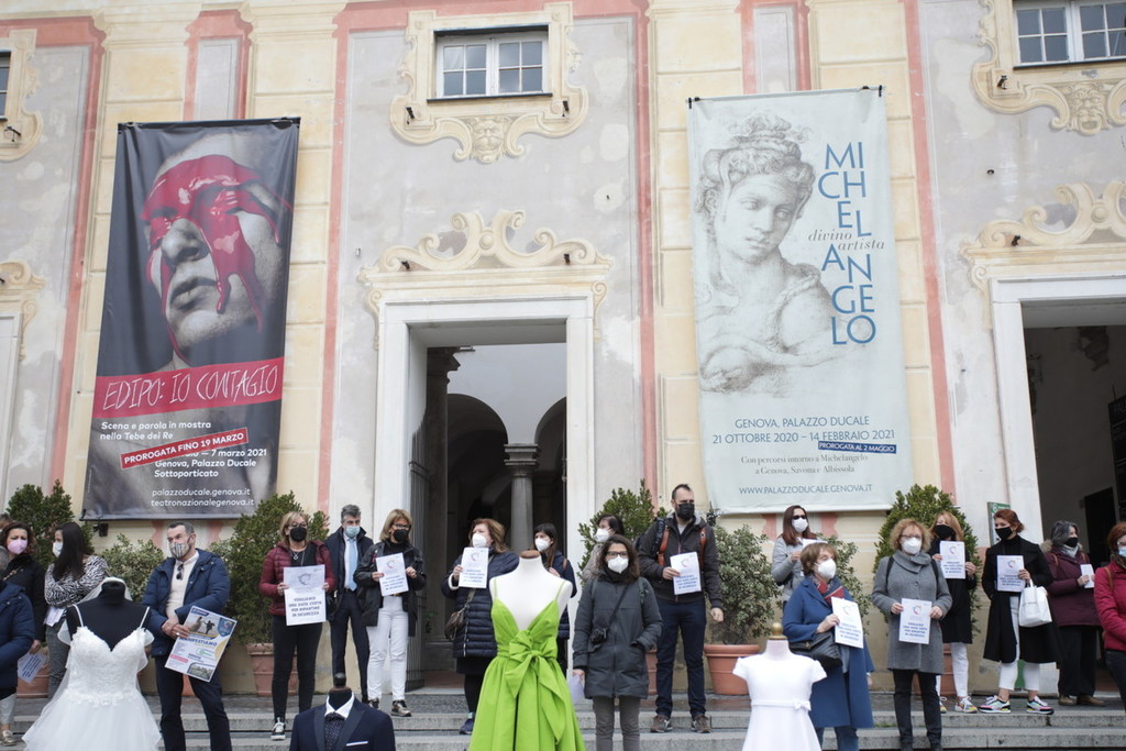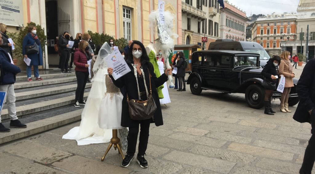 Manifestazione in piazza De Ferrari delle professioni del comparto wedding, per richiedere una data certa della ripartenza dei matrimoni e ricevimenti.