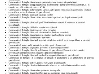 Sono sospese le attività di commercio al dettaglio, fatta eccezione per la vendita di generi alimentari e di prima necessità individuati nell'allegato 23 (in foto allegata). La vendita dei beni consentiti può avvenire sia negli esercizi “di vicinato” (piccoli negozi) sia nelle medie e grandi strutture di vendita, anche all’interno dei centri commerciali, purché sia consentito l'accesso esclusivamente agli esercizi o alle parti degli esercizi che vendono i beni consentiti.