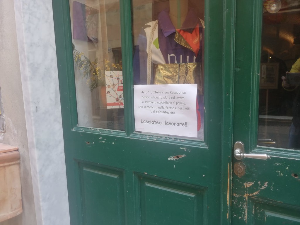 E' quella possibilità di lavorare, seguendo i protocolli già approvati da tempo, che rivendicano le attività. E lo fanno con una protesta spontanea che qualcuno definisce "gandhiana" con diversi cartelli che hanno tappezzato muri, vetrine e saracinesche dei negozi del Borgo con riportato l'articolo 1 della Costituzione.
