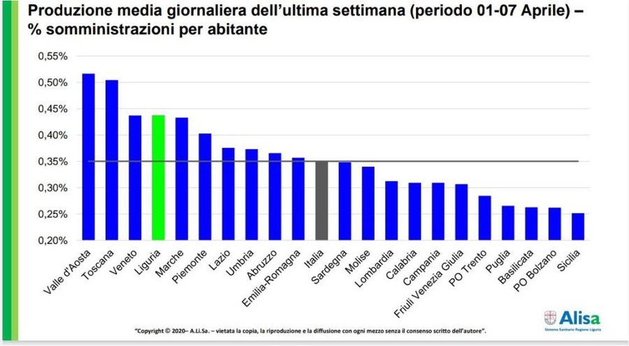 "Oggi in Liguria abbiamo somministrato quasi 14 mila vaccini, superando la soglia richiesta dal Commissario per l’emergenza, il generale Figliuolo: il 7,48% della popolazione ligure ha ricevuto entrambe le dosi, contro una media nazionale del 6%". Così il governatore regionale, Giovanni Toti, sulla propria pagina social.