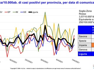 Cala l’incidenza del Covid su tutto il territorio: rispetto alla soglia di 250 casi ogni 100mila abitanti, sopra la quale il governo richiede l’adozione di ulteriori misure restrittive, la media ligure è di 161 casi, mentre nelle province l’incidenza è di 189 casi su 100mila abitanti nel savonese, 128 casi nello spezzino, 221 casi nell’imperiese e 132 casi nell’area metropolitana di Genova.