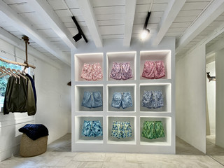 Per raggiungere tale obiettivo, Kampos si è avvalso della collaborazione di Claudia Filigheddu, artista locale, che ha dipinto sulla facciata del negozio un murales ispirato ai coralli marini e alla fantasia di uno dei modelli del brand. La cura dei dettagli e l'equilibrato accostamento cromatico conferiscono carattere e catturano lo sguardo ancor prima di entrare in negozio.
