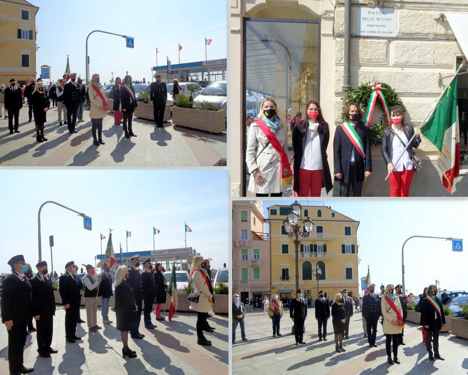 Il "clou" della manifestazione è giunto alle ore 11, in piazza Bovani, dove il vice sindaco ha posto una corona d'alloro alla lapide che ricorda il sacrificio del partigiano Nello Bovani, cui è dedicata la piazza, coadiuvato dalla vice presidente del Consiglio Comunale Michela Biggi, al suono dell'Inno di Mameli e nella composta cornice delle rappresentanza d'arma: Polizia Municipale, Carabinieri, Alpini, Bersaglieri, Marinai, Corpo delle Capitanerie di Porto, Vigili del Fuoco, Protezione Civile e di numerose autorità, fra cui il consigliere regionale Alessandro Bozzano, l'assessore alla Cultura Mariangela Calcagno, il consigliere Comunale Paola Busso e la presidente dell'Anpi.