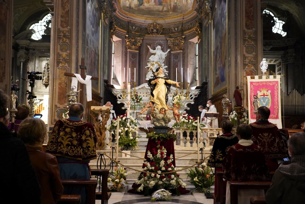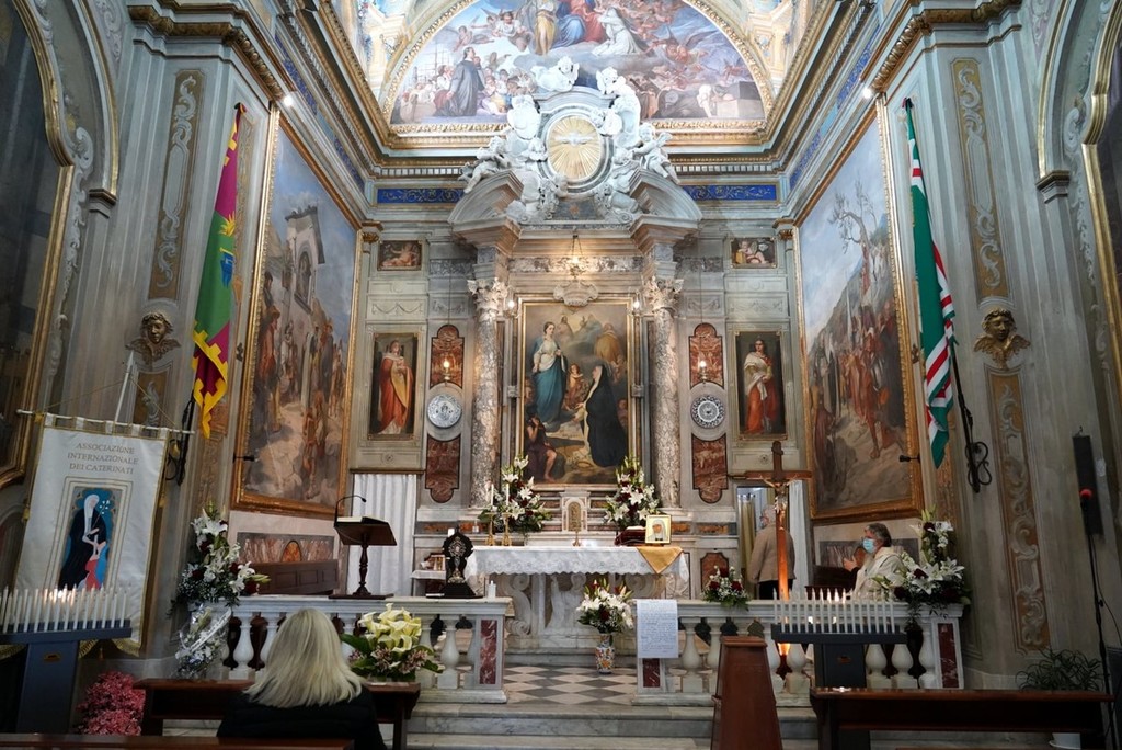 "Si racconta, infatti, che Caterina, di ritorno da Avignone, si fermò a Varazze il 3 Ottobre del 1376, quando in Liguria imperversava una terribile epidemia di peste. La religiosa senese si raccolse in preghiera, chiedendo che il male cessasse di affliggere i varazzini. L’epidemia miracolosamente cessò e la popolazioni locale, come voto, si impegnò ad erigere una Chiesa in onore della SS. Trinità. Seppur di modeste dimensioni, la costruzione terminò l’anno seguente, in tempo per il ritorno nel borgo rivierasco di Caterina. Da allora la tradizione vuole che i varazzini, durante la ricorrenza patronale, sciolgano quel voto" spiegano dalla pagina Facebook Città di Varazze.