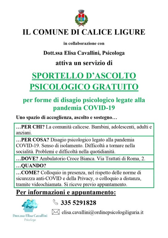 Con queste premesse nel Comune di Calice proseguirà l'attività dello "Sportello d'ascolto e supporto psicologico" proseguirà ancora per un mese: "Come comunicato dall’assessore Enrica Brambilla - scrive in una nota il sindaco Alessandro Comi - confermiamo che il servizio di ascolto e supporto psicologico gratuito, pensato per venire incontro a coloro che percepiscano disagi causati da questo difficile periodo di emergenza sanitaria, è stato prorogato fino alla fine di maggio".