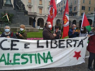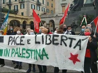 "Pace e libertà in Palestina". Queste la frase scritta in uno striscione esposto in piazza Mameli a Savona nel presidio permanente #restiamoumani a favore del popolo palestinese.