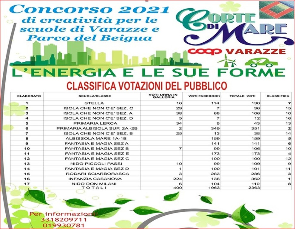 Giovedì 22 aprile 2021 la giuria tecnica del concorso "L’energia e le sue forme", istituito dal Centro Commerciale “Corte di Mare” e riservato alle scuole materne ed elementari di Varazze e dei paesi del circondario del Parco del Beigua, con l’obiettivo di sensibilizzare sulle tematiche ambientali, ha proclamato vincitrice l’Asilo di Varazze “L’isola che non c’è” e, come da regolamento, i 17 elaborati realizzati da circa 350 alunni delle scuole partecipanti, sono rimasti esposti nella galleria del centro commerciale fino al 10 maggio, per essere votati dal pubblico.