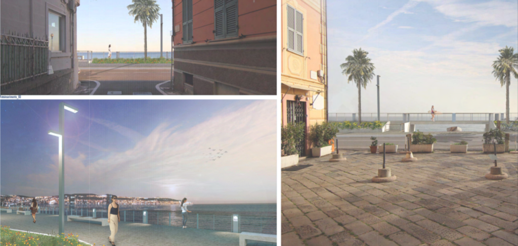 Il progetto prevede la demolizione del marciapiede esistente per realizzare una passeggiata a sbalzo, arricchita con arredo e verde urbano e una nuova illuminazione. Le cabine degli stabilimenti troveranno spazio al di sotto della promenade, assicurando la vista dell’orizzonte tutto l’anno.