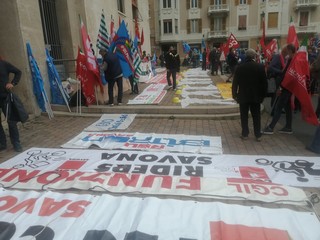 Da una distesa di caschetti e tute di fronte al palazzo della Prefettura di Savona si alza il grido d'allarme per fermare la strage nei luoghi di lavoro di Cgil, Cisl e Uil.