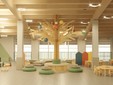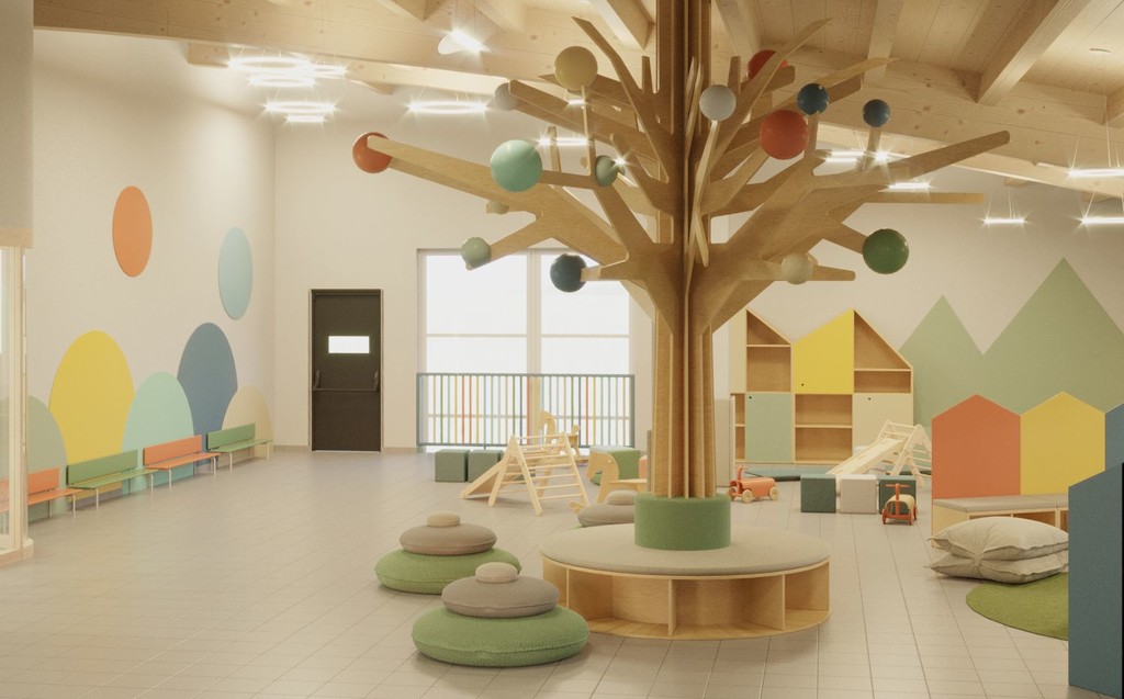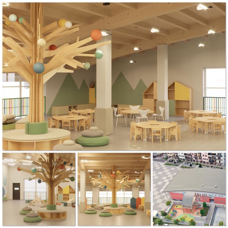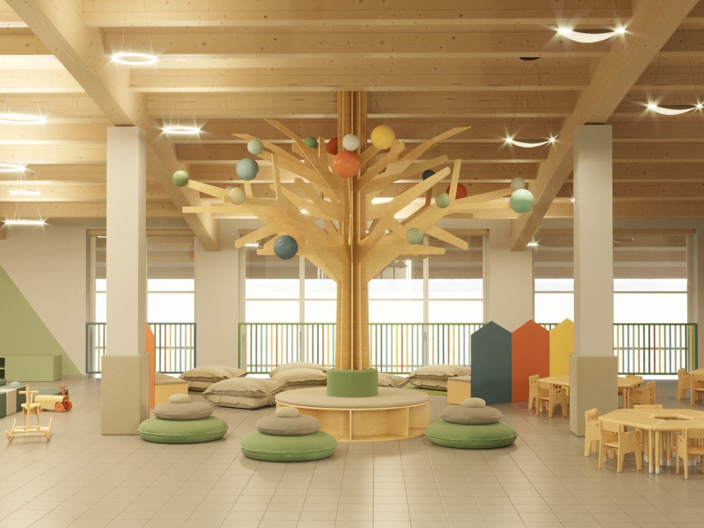 Per la progettazione del nuovo asilo infantile comunale è stata utilizzata la massima accortezza per rendere gli spazi a misura di bambino: grande uso del legno per l'arredo, colori tenui e materiali tinta pastello per le pareti.