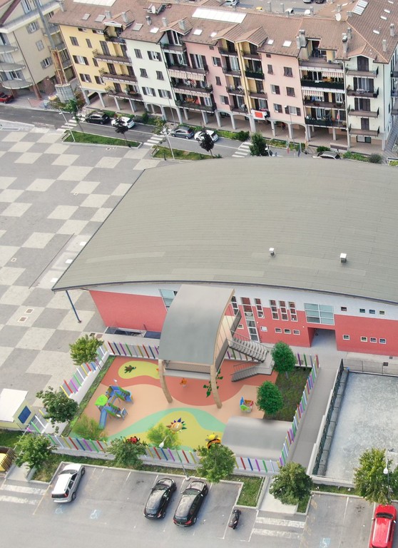 Il progetto prevede un sistema illumino-tecnico LED, nuovi sanitari e materiali tecnologici per i servizi. Una struttura esterna avveniristica come terza uscita di sicurezza che confluirà in uno spazio (sempre esteriore) completamente rivestito in gomma drenante. Nuovi giochi di ultima generazione e alberature per creare coni d’ombra. Inoltre è stato compreso lo spostamento dei giochi per i bambini ad uso pubblico nell'area adiacente alla costruzione.