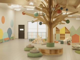 Per la progettazione del nuovo asilo infantile comunale è stata utilizzata la massima accortezza per rendere gli spazi a misura di bambino: grande uso del legno per l'arredo, colori tenui e materiali tinta pastello per le pareti.