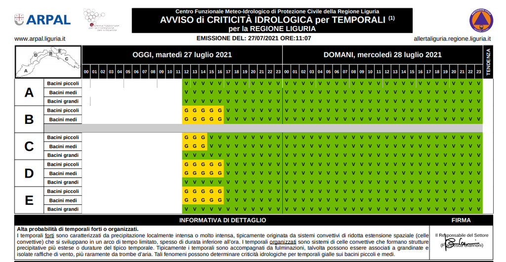 Allerta meteo gialla per temporali: chiusura confermata alle 15.00 sul levante (zona C); allerta prolungata fino alle 17 su centro e versanti padani (zone B, D, E).