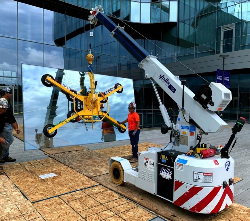 nell’edilizia le gru elettriche Valla Pich and Carry accessoriate con il manipolatore a ventosa utilizzato per il posizionamento delle vetrate
