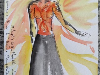 Monica ha eseguito la performance artistica, dal titolo "Di luce e tenebra", tra le 19 e le 20.30 circa, dipingendo sul corpo della modella Irene Pizzorno dei soggetti ispirati alla rinascita e alla luce dopo le tenebre: sul petto della ragazza infatti ha dipinto una fenice luminosa, animale fantastico che da sempre simboleggia la rinascita dalle ceneri e sulla schiena ha realizzato una riproduzione di "San Matteo e l'angelo" del Caravaggio, ispirandosi a un brano attribuito all'artista. L'opera vivente ha poi sfilato per le vie di Altare, fermandosi nelle varie postazioni della festa.