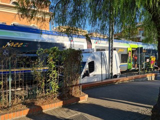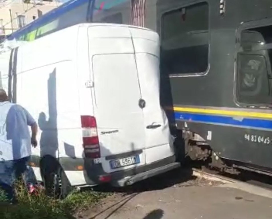 Attimi di paura a Loano all'altezza del centralissimo passaggio a livello di via Stella dove un treno Jazz in transito e un furgoncino sono entrati in collisione.