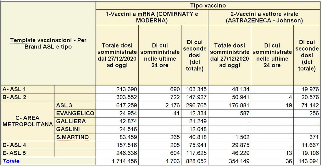 Sono 65 i nuovi positivi al Covid-19 oggi in Liguria, a fronte di 1.440 tamponi molecolari (oltre ai 1.141 antigenici rapidi), uno ogni 22,15 pari al 4,51%.
