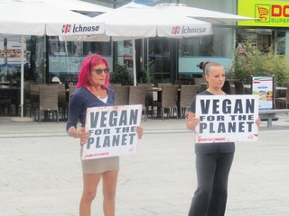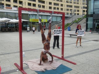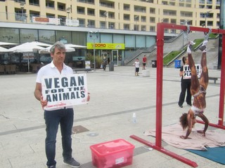 "A testa in giù". Questo il nome del flashmob svolto oggi in piazza Calabresi nella Darsena di Savona organizzato dall'associazione Iene Vegane, dopo l'appuntamento dello scorso 11 luglio in piazza Guido Rossa.
