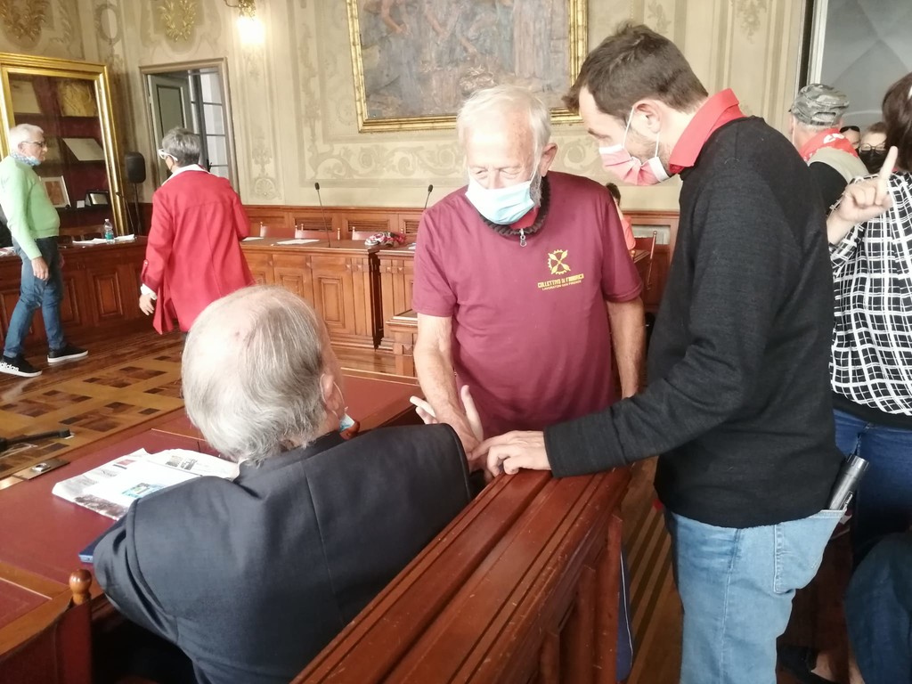Seduta preceduta da un breve scambio di battute tra il sindaco e Adelmo Cervi, giunto dall'Emilia per perorare la causa condivisa anche dall'Anpi, che insieme ad altre associazioni e formazioni politiche ha organizzato un presidio in via Pertica, proprio sotto il Palazzo di Città.