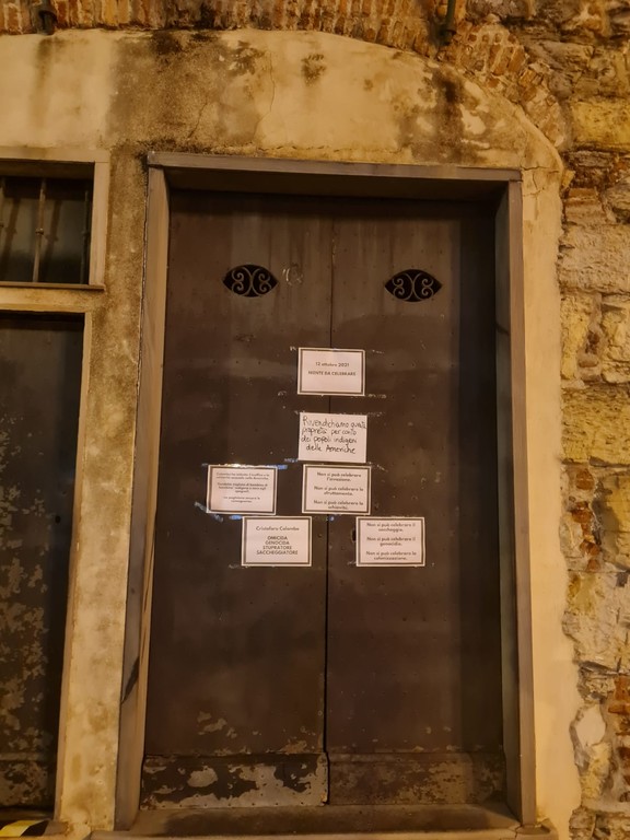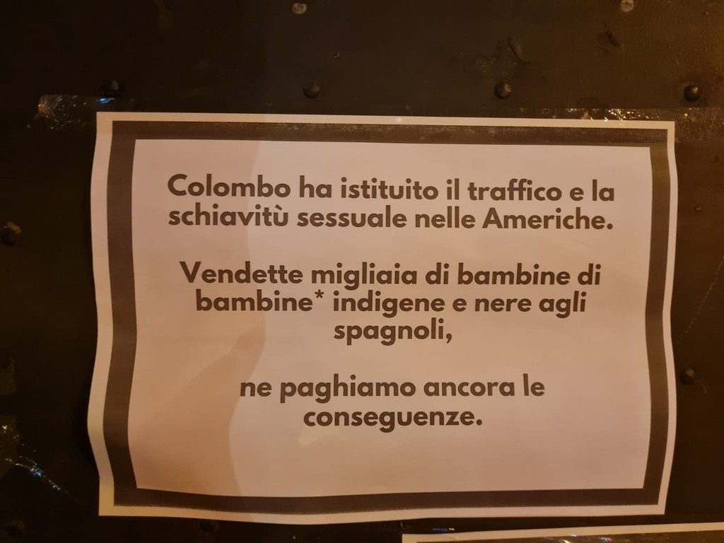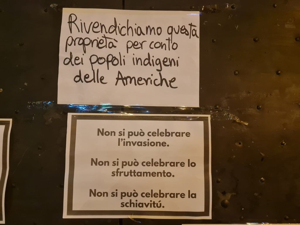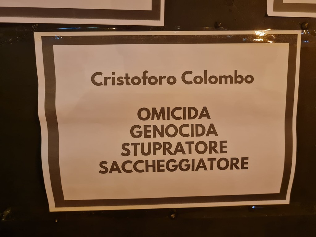 Nel giorno delle celebrazioni per il Columbus Day, il giorno della scoperta dell'America da parte di Cristoforo Colombo, davanti all'ingresso della casa natale del celebre navigatore genovese sono stati affissi alcuni cartelli che contestano la figura di Colombo