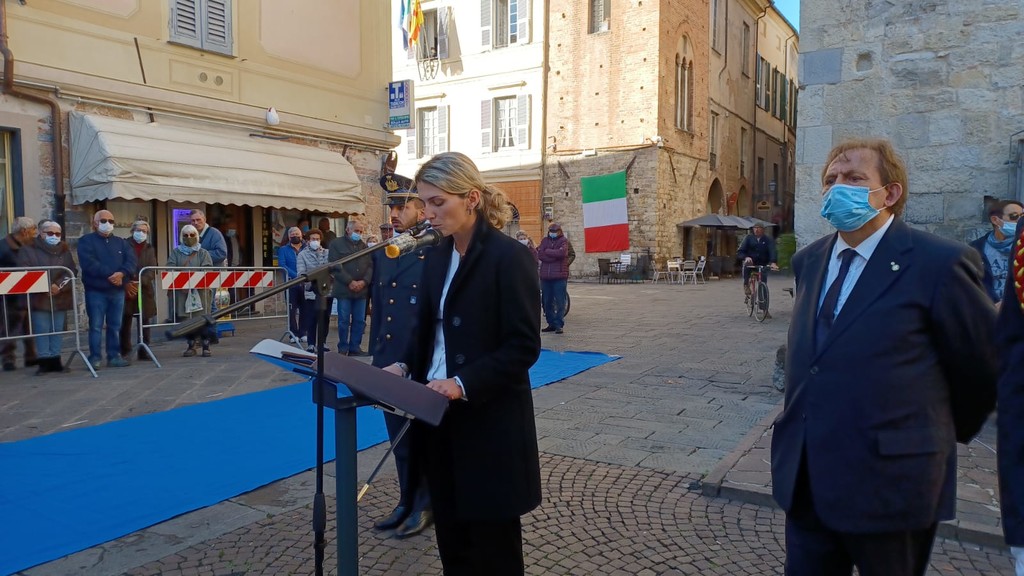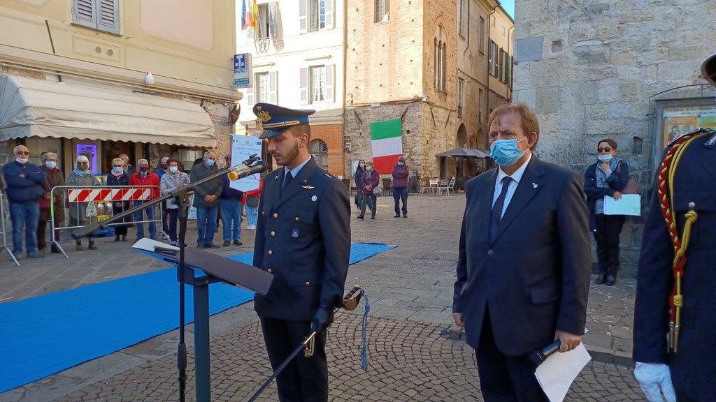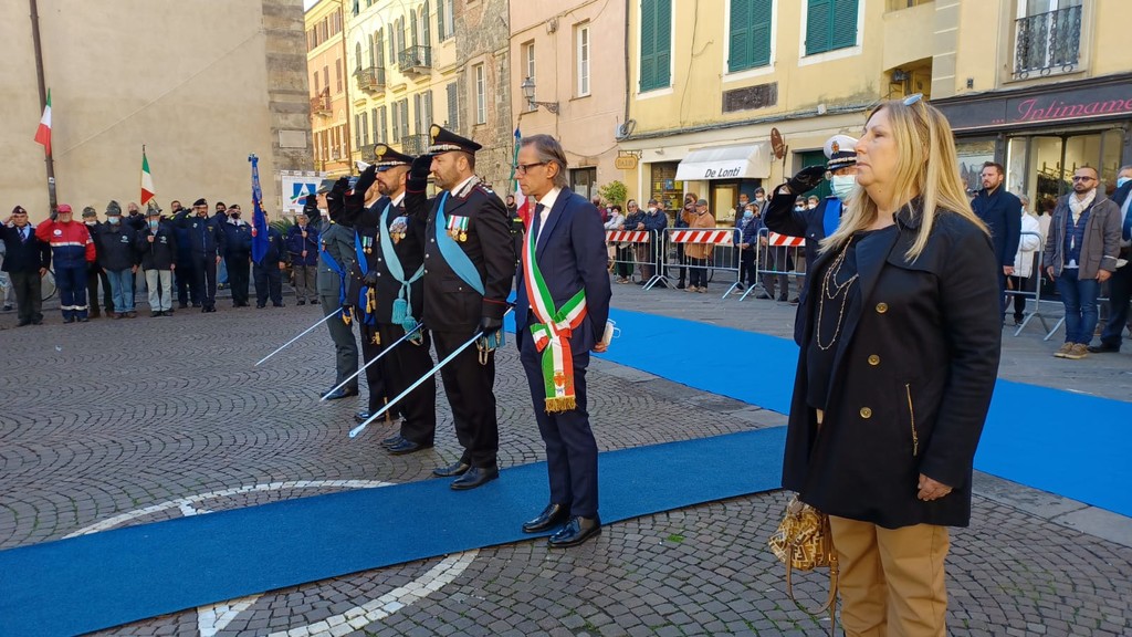 Dopo il discorso del primo cittadino Riccardo Tomatis, la cerimonia ha proseguito con la deposizione della corona di alloro al Monumento dei Caduti.