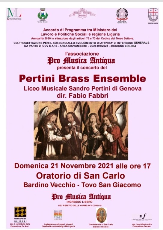 Il Distretto Sociosanitario del Finale, con la collaborazione della Confraternita San Carlo di Bardino Vecchio e del Comune di Tovo San Giacomo, invita a partecipare al concerto organizzato dall’Associazione Pro Musica Antiqua in collaborazione con il Liceo Musicale Sandro Pertini di Genova che si terrà domenica 21 novembre, alle ore 17.00, presso l’Oratorio San Carlo di Bardino Vecchio.