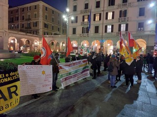 In piazza un centinaio i presenti tra semplici cittadini e rappresentanti di ACLI, ANED, ANPI, ARCI, CGIL, CISL, CUB, EMERGENCY, ISREC, UAAR, UDI, UIL.