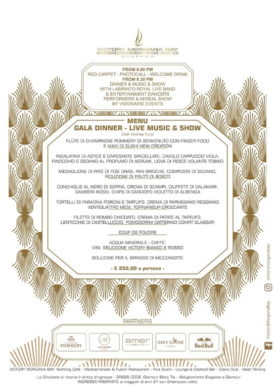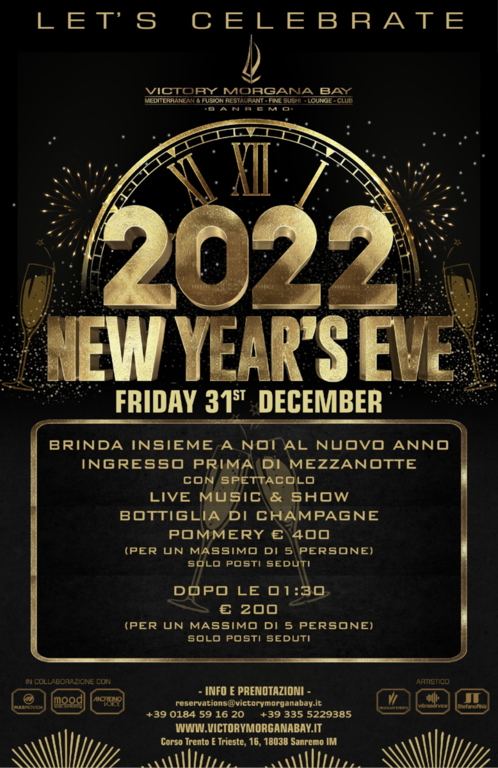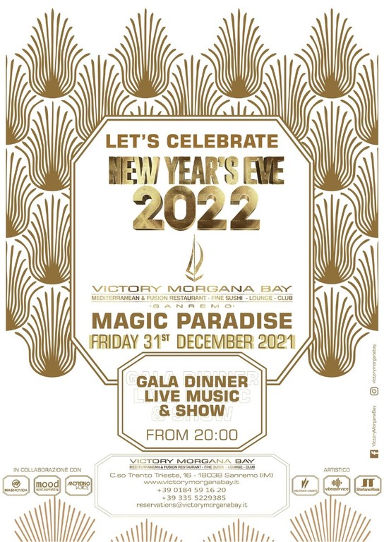 Intitolato New Year’s Eve 2022 - Let’s Celebrate Magic Paradise, l’evento di Capodanno del Victory prevede un raffinato menù degustazione a cura dello Chef Andrea Tucci e dalla sua brigata di cucina che sarà servito dalle 20.00 alle 00.30.