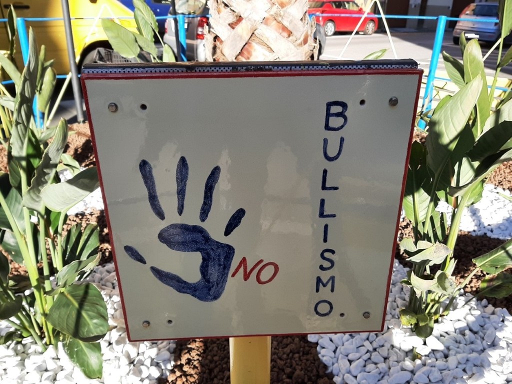 Una targa in ceramica dedicata alla lotta contro il bullismo posizionata ad Albissola Marina nella riqualificata aiuola circolare davanti ai cancelli d'ingresso delle scuole elementari.
