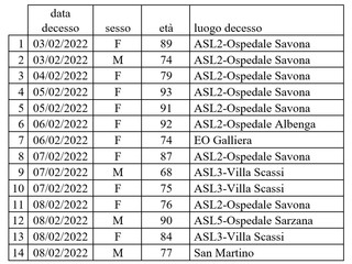 A livello regionale vengono segnalati 14 decessi nell'arco temporale compreso tra il 3 e l'8 febbraio