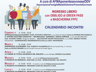 Venerdì 4 marzo continuano gli incontri di “Conoscere l’Alzheimer 2022” con il patrocinio dell’ASL2 Savonese, dell’Ordine dei Medici di Savona e della Provincia di Savona che si svolgono nella Sala Congressi dell'Ospedale S. Corona di Pietra Ligure (Scuola Infermieri) Aula “A” piano terra, dalle ore 15:00 alle ore 16:30.