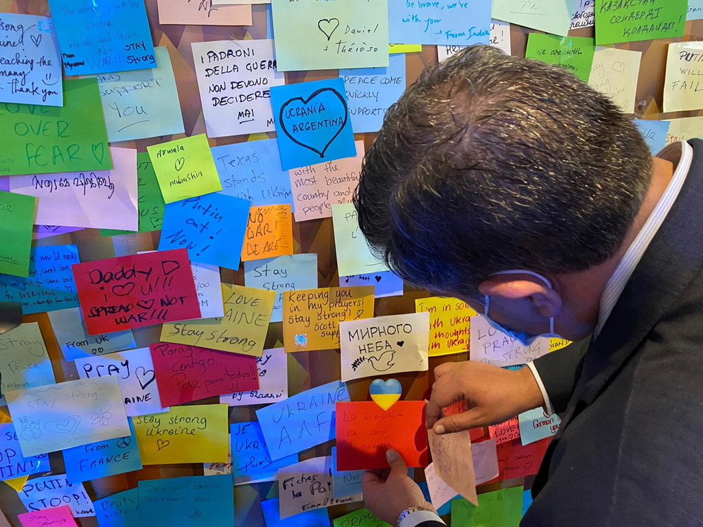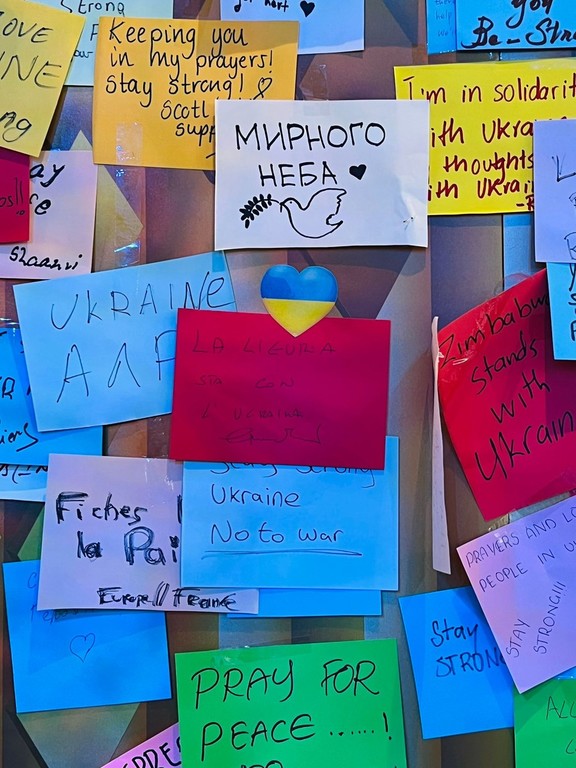 “La Liguria sta con l’Ucraina”. Questo il testo del biglietto di solidarietà e vicinanza che il presidente della Regione Liguria Giovanni Toti, negli Emirati in occasione del Regional Day dedicato alla Liguria a Expo Dubai 2020, ha lasciato all’interno del padiglione Ucraina, unendosi a centinaia di altri messaggi di vicinanza alla popolazione.