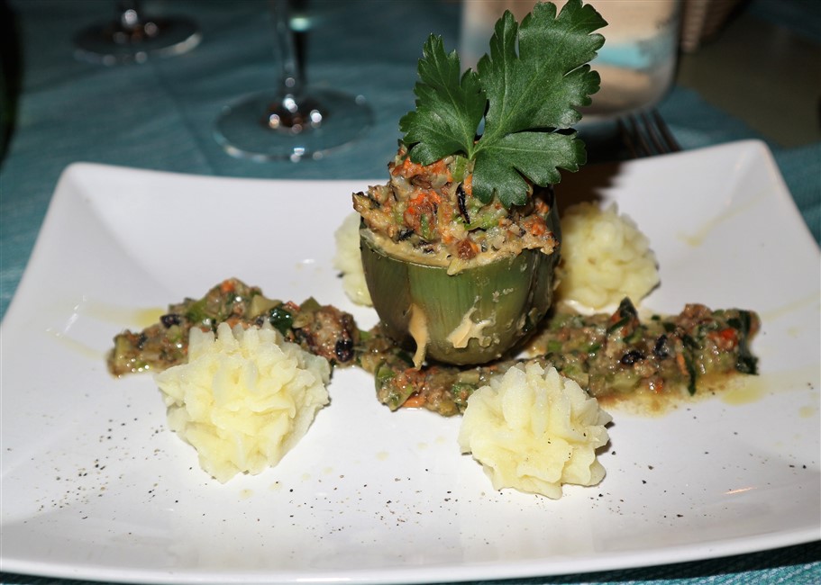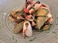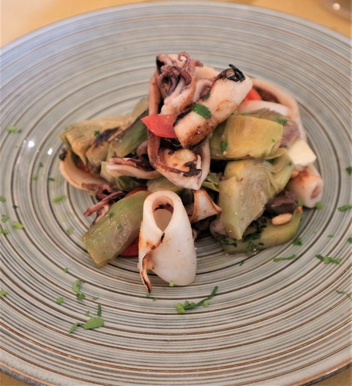 - Calamari ripieni di gamberi e carciofi e salsa antispreco di gambi di carciofo;
