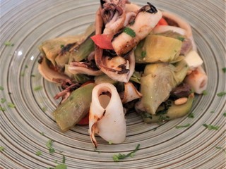 - Calamari ripieni di gamberi e carciofi e salsa antispreco di gambi di carciofo;