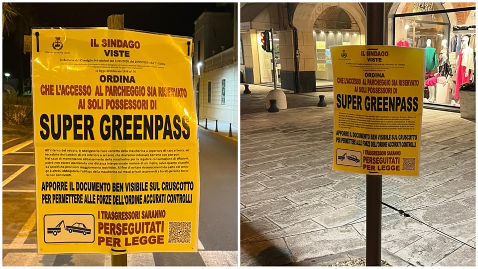 Stato di emergenza concluso? A Pietra Ligure qualche dubbio è sorto a chi stamane si è imbattuto in alcuni cartelli tra il lungomare e piazzale Geddo. Lì infatti, da qualche ora, sono spuntate indicazioni particolarmente chiare: "parcheggio riservato ai soli possessori di Super Greenpass".