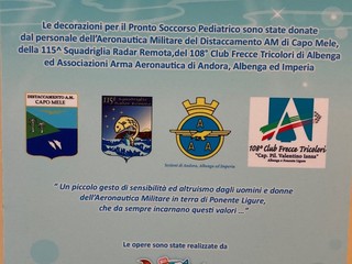 Grazie ad una raccolta fondi volontaria del Distaccamento dell'Aeronautica Militare Capo Mele, della 115^ Squadriglia Radar Remota(S.S.R.), unitamente alle Associazioni di Andora, Albenga ed Imperia ed al 108^ Club Frecce Tricolori, questa mattina sono stati installati una decina di pannelli presso l’area pediatrica del Pronto soccorso del S. Corona. I murales artistici sono stati realizzati dal Maestro Silvio Irilli di Ospedali Dipinti.