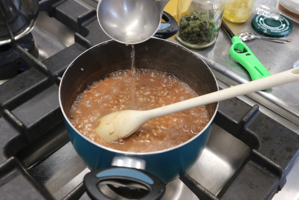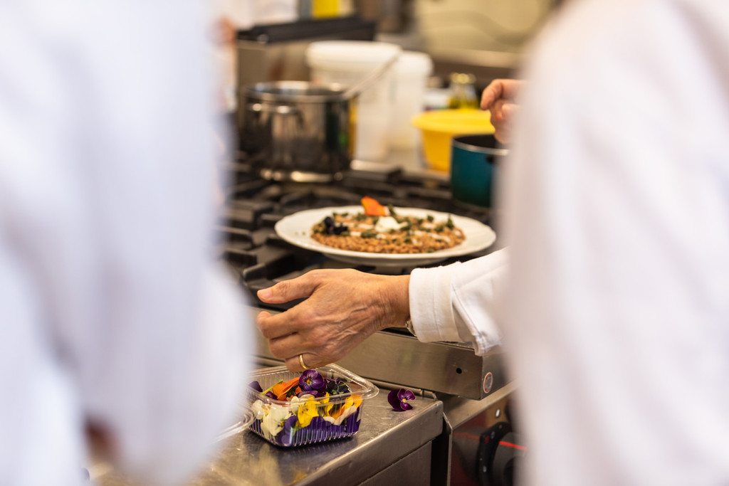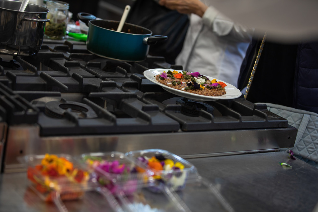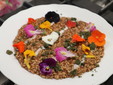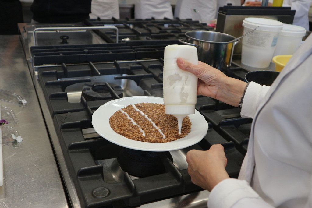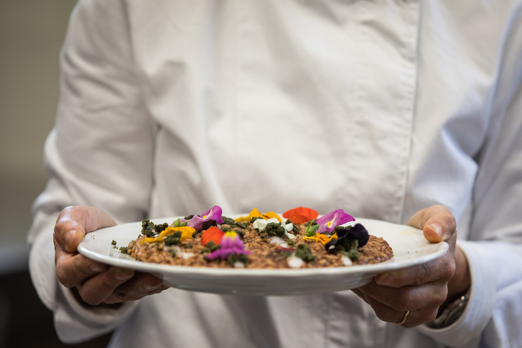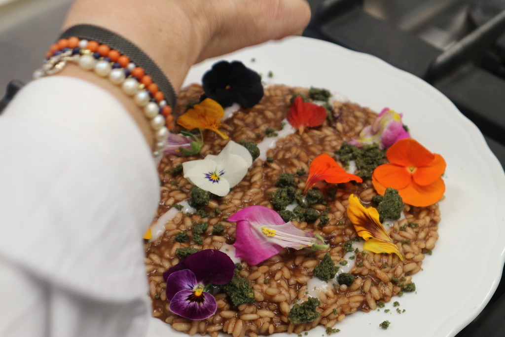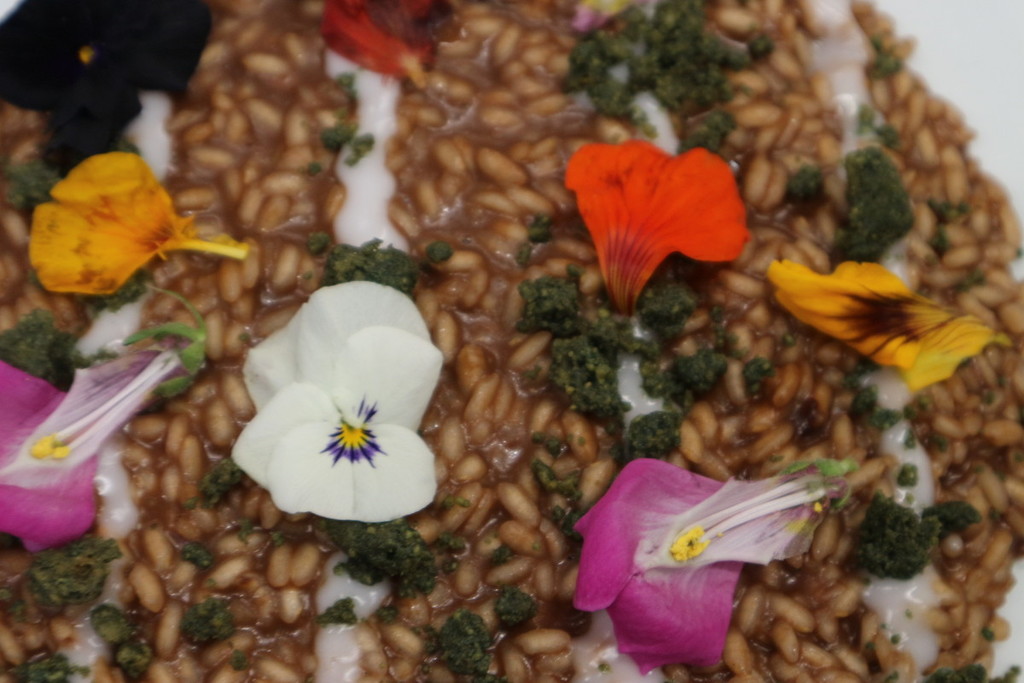 Ecco la video ricetta del “Risotto con cioccolato fondente e Crumble di foglie e fiori di Nasturzio, con brodo di Geranio e fiori eduli”