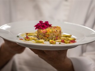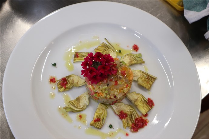 Ecco la video ricetta del ““Tartare di Gamberi con verdurine fresche e carciofo violetto d’Albenga con misto fiori eduli e crema di Begonia”