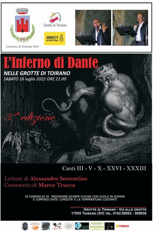 Si svolgerà sabato 16 luglio prossimo, alle ore 21.00, nel tratto conclusivo della Grotta di Santa Lucia Inferiore – il cosiddetto “Tanone” –, all’interno del ben noto complesso carsico in provincia di Savona, la terza edizione di “L’Inferno di Dante nelle Grotte di Toirano”.