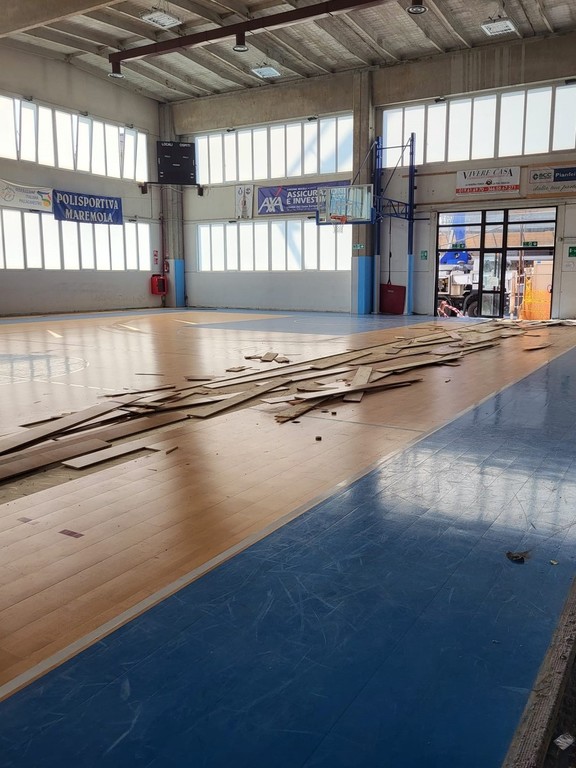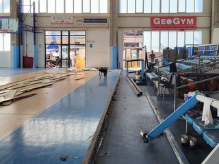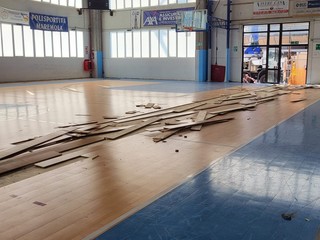 L’intervento, finalizzato alla messa in sicurezza del campo da gioco e, grazie all’allargamento di un metro in larghezza, al suo adeguamento alle norme vigenti, prevede la sostituzione della pavimentazione in legno attualmente ammalorata, con la rimozione integrale di tutta la superficie e i necessari lavori accessori quali lo spostamento della ringhiera di separazione con il pubblico, la modifica di un'uscita di sicurezza sul prospetto sud e, successivamente, la sostituzione dei serramenti del prospetto ovest al fine dell'adeguamento energetico dello stabile.