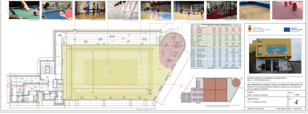 "Tenuto conto dell'interesse dell'Amministrazione Comunale di attuare l'intervento di recupero del complesso riqualificandolo a funzioni sportive e di aggregazione giovanile escludendo il recupero quale impianto natatorio, si rendeva necessario avviare un percorso finalizzato allo sviluppo di un documento di fattibilità delle alternative progettuali che contenesse le soluzioni tecniche tali da poter consentire la realizzazione di tali interventi nel rispetto dell'importo economico finanziato e con la finalità di realizzare un centro sportivo polivalente con la trasformazione della sala natatoria in uno spazio ove praticare discipline sportive e olistiche nonché la creazione di un Centro di Aggregazione Giovanile per offrire occasioni di libera aggregazione, attività di sostegno scolastico e attività laboratoriali fornendo ai ragazzi una valida alternativa alla cultura della strada e un aiuto concreto nell’affrontare problemi sia nell’ambiente scolastico sia in quello familiare" viene spiegato nella delibera di giunta.